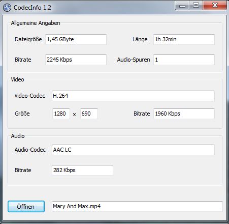 mit "Öffnen" in das Programm laden. CodecInfo analysiert die entsprechenden Informationen und trägt