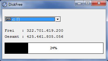 procedure TForm1.dcDriveChange(Sender: TObject); var s : string[255]; frei, gesamt : double; begin s := UpperCase(dcDrive.Drive); frei := DiskFree(Ord(s[1])-64); gesamt := DiskSize(Ord(s[1])-64); Label1.Caption :=Format('Frei : %15.0n',[frei]); Label2.Caption := Format('Gesamt : %15.0n',[gesamt]); Gauge1.Progress := Round((gesamt-frei)/gesamt*100); end;